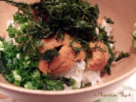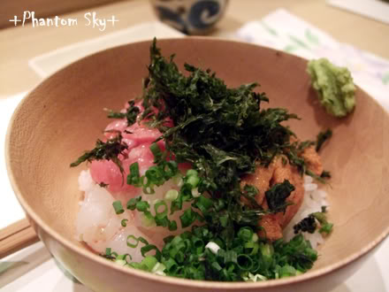 鮪魚肚肉,兩種海膽(其中一種是稚內生海膽),還有我忘記是蝦子還是花枝的東西,青蔥,海苔等